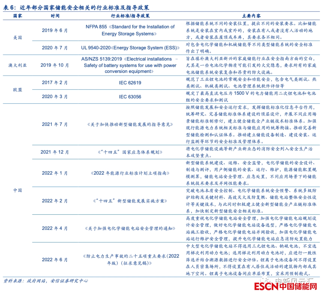 儲能行業(yè)安全標(biāo)準趨嚴,全釩液流電池優(yōu)勢凸顯。隨著儲能安全問題日益顯現(xiàn),近年來海內(nèi)外正加緊出臺針對儲能行業(yè)的安全規(guī)范與行業(yè)標(biāo)準,例如美國于2016年率先發(fā)布全球第一項儲能系統(tǒng)安全標(biāo)準UL9540,對電化學(xué)儲能、機械儲能等不同類型儲能系統(tǒng)的安全標(biāo)準作出了明確規(guī)定。我國儲能行業(yè)起步較晚,長期以來政策標(biāo)準與行業(yè)規(guī)范相對缺失,但隨著近年來儲能行業(yè)發(fā)展不斷提速,儲能安全問題愈發(fā)得到重視,相關(guān)政策文件陸續(xù)出臺,行業(yè)標(biāo)準逐步完善。國家能源局2022年6月印發(fā)的《防止電力生產(chǎn)事故的二十五項重點要求(2022年版)(征求意見稿)》中明確提出“中大型電化學(xué)儲能電站不得選用三元鋰電池、鈉硫電池,不宜選用梯次利用動力電池”,且“鋰離子電池設(shè)備間不得設(shè)置在人員密集場所,不得設(shè)置在有人居住或活動的建筑物內(nèi)部或其地下空間”,對鋰電池儲能的適用范圍進行了嚴格限制。我們認為隨著儲能行業(yè)安全標(biāo)準的提升,安全性更佳的全釩液流電池將得到更多關(guān)注,后續(xù)應(yīng)用場景有望逐步拓寬。