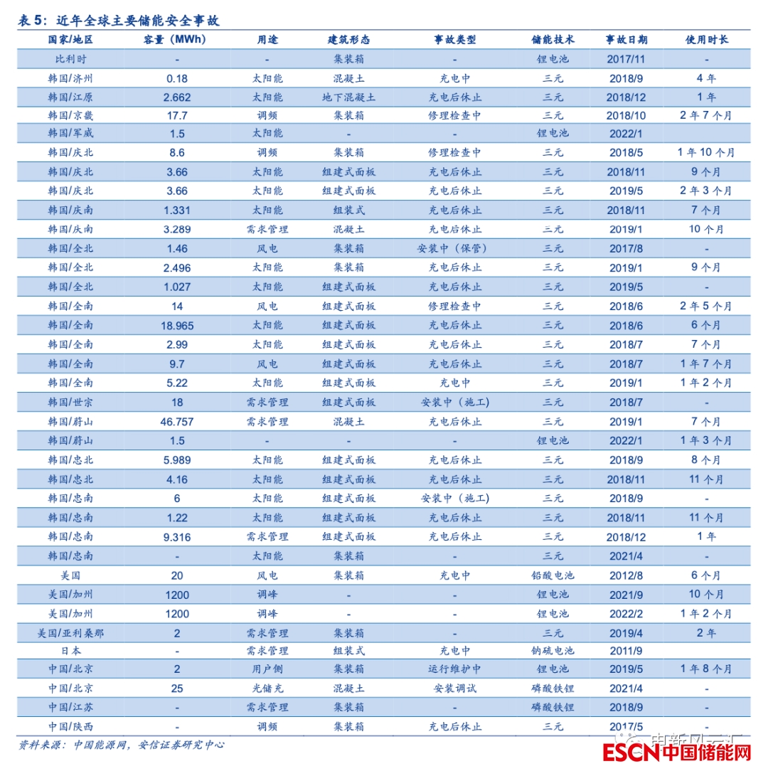 國內(nèi)外鋰電池儲能事故頻發(fā),安全問題不容忽視。根據(jù)中國能源網(wǎng)的統(tǒng)計,2010-2020年間全球范圍內(nèi)發(fā)生了32起儲能電站安全事故,而根據(jù)CNESA的統(tǒng)計,僅2021年全球就發(fā)生了至少9起儲能安全事故,2022年初韓國又發(fā)生3起電池相關(guān)火災(zāi)事故。頻繁發(fā)生的儲能安全事故不但造成了嚴重的經(jīng)濟損失,嚴重時還對人員安全構(gòu)成了較大威脅,在全球儲能市場迎來加速發(fā)展的關(guān)鍵節(jié)點,安全問題已經(jīng)成為行業(yè)亟待解決的重要問題之一,我們認為未來安全性將成為鋰電池儲能面臨的一個巨大挑戰(zhàn)。