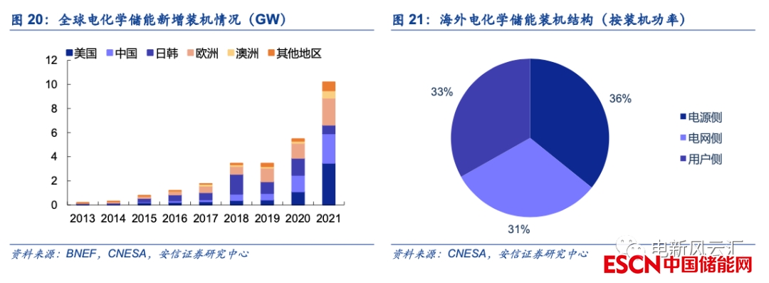 市場化驅(qū)動快速發(fā)展,供電側(cè)與用戶側(cè)齊頭并進。目前除中國以外,海外儲能市場主要分布在美國、歐洲、日韓、澳洲等發(fā)達地區(qū),相對而言這些地區(qū)電力市場化程度較高,隨著近年來儲能成本的持續(xù)下降,行業(yè)已逐步進入經(jīng)濟性驅(qū)動的自發(fā)增長階段。從裝機結(jié)構(gòu)來看,海外市場供電側(cè)與用戶側(cè)儲能的發(fā)展較為均衡,2021年新增裝機中電源側(cè)、電網(wǎng)側(cè)、用戶側(cè)的占比大致相當(dāng)。