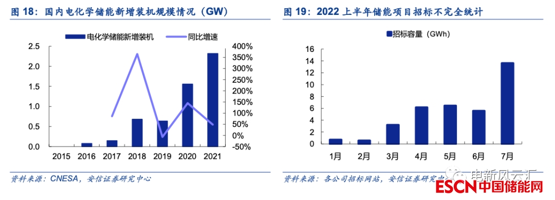 2022年國內(nèi)儲能行業(yè)正式步入發(fā)展快車道。2021年國家、地方層面均有儲能政策密集出臺,但主要側(cè)重在整體部署層面,相關(guān)的配套細則尚不完善,因此2021年為國內(nèi)儲能行業(yè)由商業(yè)化起步邁向規(guī)?;l(fā)展的過渡之年,實際落地的項目規(guī)模相對有限。根據(jù)CNESA的統(tǒng)計,2021年國內(nèi)新增新型儲能裝機2.4GW/4.9GWh,較2020年同比增長約54%,其中電化學(xué)儲能裝機2.32GW,同比增長近49%。2022年上半年受制于疫情、原材料漲價等多方面因素的影響,國內(nèi)儲能項目建設(shè)節(jié)奏整體偏慢,但二季度起國內(nèi)儲能項目招標(biāo)已集中啟動,根據(jù)我們的不完全統(tǒng)計,在排除無法取得具體招標(biāo)規(guī)模的項目后,今年上半年國內(nèi)儲能(不包括抽水蓄能)總計招標(biāo)容量已經(jīng)達到8GW/22GWh以上(主要統(tǒng)計EPC、儲能集成系統(tǒng)以及相關(guān)設(shè)備),其中二季度合計招標(biāo)量超18GWh,招標(biāo)規(guī)模較一季度明顯提升。經(jīng)過上半年的觀望與前期準備,我們預(yù)計下半年起國內(nèi)儲能項目建設(shè)速度將明顯加快,僅7月我們統(tǒng)計到的國內(nèi)儲能項目招標(biāo)規(guī)模就已超過13GWh(包括南網(wǎng)科技、華電等框架性協(xié)議)。