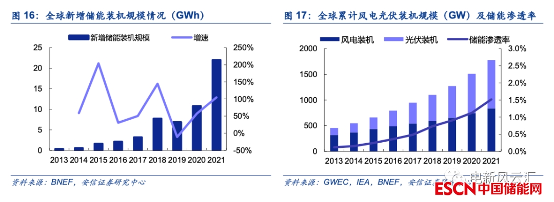 2021年起全球儲能行業(yè)進入高速發(fā)展階段。根據(jù)BNEF統(tǒng)計,2021年全球新增儲能裝機規(guī)模為10GW/22GWh,較2020年實現(xiàn)翻倍以上增長,截至2021年底全球累計儲能裝機容量約為27GW/56GWh??紤]到2021年底全球累計風(fēng)電/光伏裝機規(guī)模已達到837/942GW,以此推算儲能在全球風(fēng)電光伏裝機中的占比僅為1.5%,我們認為儲能市場的高速增長才剛剛開始,行業(yè)發(fā)展前景廣闊。