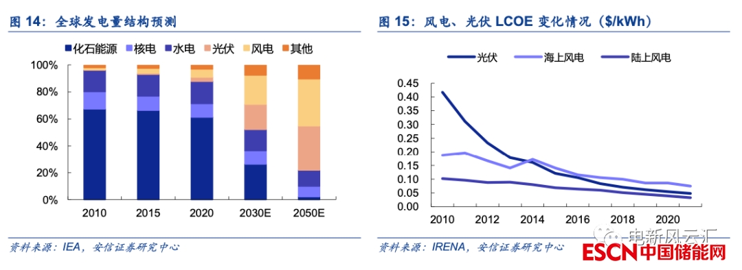 全球能源轉(zhuǎn)型加速,儲能行業(yè)規(guī)模化發(fā)展的條件已經(jīng)成熟。一方面,根據(jù)IEA的測算,為實現(xiàn)2050年碳中和的目標(biāo),可再生能源發(fā)電占比需由2020年的30%以下提升至2030年的60%以上,2050年則需達到近90%,而隨著光伏、風(fēng)電等波動性能源加速取代傳統(tǒng)的火電裝機,電力系統(tǒng)面臨的挑戰(zhàn)正日益凸顯。另一方面,隨著技術(shù)的進步與產(chǎn)能的擴張,近年來風(fēng)電、光伏的發(fā)電成本降幅顯著,在上網(wǎng)側(cè)平價的基礎(chǔ)上,當(dāng)前全球正朝著“新能源+儲能”平價的方向快速前進。與此同時,經(jīng)過前期的探索與實踐,儲能在電力系統(tǒng)中的定位與商業(yè)模式正日漸清晰,目前美國、歐洲等發(fā)達地區(qū)儲能市場化發(fā)展的機制已基本建立,新興市場的電力系統(tǒng)改革亦持續(xù)加速,儲能行業(yè)規(guī)?;l(fā)展的條件已經(jīng)成熟。