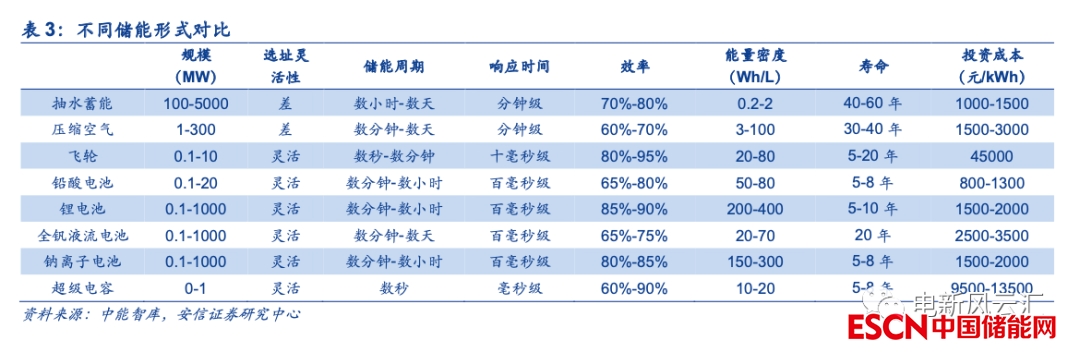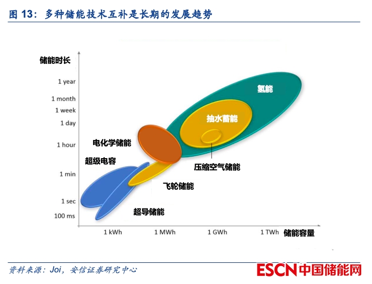 隨著儲能場景日漸多元化,多種儲能技術(shù)并存將成為長期發(fā)展趨勢。目前全球范圍內(nèi)傳統(tǒng)火電裝機仍占據(jù)主體地位,風(fēng)電、光伏的發(fā)電占比僅為10%左右,因此儲能在電力系統(tǒng)中主要起到輔助的作用,用于解決短時間、小范圍的供需不平衡。但長期來看,隨著新能源逐步成為電力系統(tǒng)的主體,儲能的應(yīng)用場景也將持續(xù)拓寬,功率范圍將涵蓋kW級的用戶側(cè)場景到GW級的發(fā)電側(cè)、電網(wǎng)側(cè)場景,儲能時長則從秒級、分鐘級、小時級到跨日、跨季不等。考慮到不同場景的儲能需求存在較大差異,我們認為未來不太可能出現(xiàn)一種儲能技術(shù)“一統(tǒng)天下”的局面,而是多種儲能技術(shù)并存,共同支撐電力系統(tǒng)的安全與穩(wěn)定。