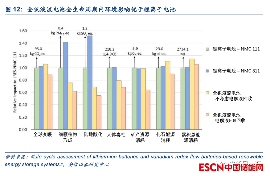 全釩液流電池在運行過程中不涉及污染與排放,且電解液可循環(huán)利用,是一種綠色環(huán)保的儲能形式。全釩液流電池中釩元素以離子形式存在于酸性水系溶液中,而不是以釩的氧化物形式存在(如五氧化二釩),有一定的腐蝕性但無毒性,且工作過程中封閉運行,對環(huán)境與人體基本不會產(chǎn)生危害。此外,從全生命周期的角度來看,鋰電池儲能系統(tǒng)在壽命到期后各類材料的回收處理難度較大,而全釩液流電池的釩電解液可在電池領(lǐng)域長期循環(huán)使用或進行釩提取進入鋼鐵、合金等其他市場領(lǐng)域,電堆關(guān)鍵部件(如碳電極、雙極板、離子交換膜等)以及管路、閥泵等的處理也更為簡單,無環(huán)境負擔(dān),所以無論是從回收成本角度還是污染排放角度均優(yōu)于鋰電池。根據(jù)根特大學(xué)的研究,在釩電解液50%回收的條件下,全釩液流電池在陸地酸化、人體毒性、細顆粒物形成、礦產(chǎn)資源消耗、化石能源消耗等方面的環(huán)境影響幾乎全面低于鋰離子電池。