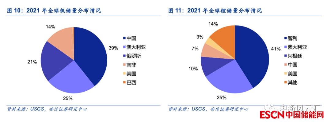 中國為釩生產(chǎn)與消費大國,釩資源自主可控。根據(jù)USGS的估算,2021年底中國釩儲量規(guī)模約為950萬噸(本段均以釩金屬當(dāng)量計),在全球儲量中的占比約為40%,而從產(chǎn)量來看,2021年中國釩產(chǎn)量達到7.3萬噸,在全球產(chǎn)量中的占比接近2/3,因此無論是從儲量還是產(chǎn)能的角度出發(fā),我國對釩資源均有較強的掌控能力。相較而言,2021年國內(nèi)鋰資源的全球儲量占比僅為7%,產(chǎn)量占比不到15%,鋰電產(chǎn)業(yè)鏈對海外礦產(chǎn)資源的依賴較強。