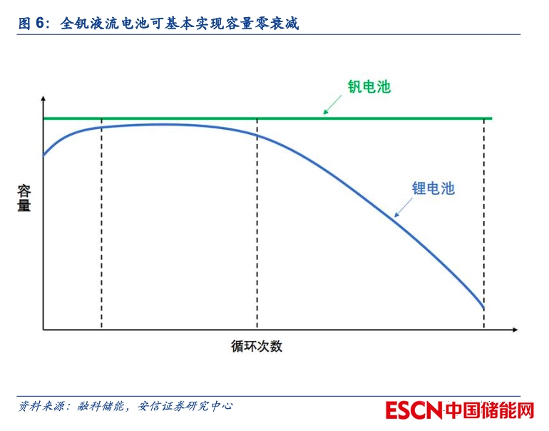全釩液流電池循環(huán)次數(shù)明顯優(yōu)于鋰離子電池,且生命周期內(nèi)容量可完全恢復(fù),生命周期內(nèi)度電容量可利用率高。一方面,全釩液流電池使用不同價態(tài)的釩離子作為電池的活性物質(zhì),反應(yīng)過程僅為釩離子的價態(tài)變化,不涉及液固相變,且克服了電解質(zhì)交叉污染的問題;另一方面,全釩液流電池的在充放電過程中電極材料不參與電化學(xué)反應(yīng),屬于惰性電極,電極和雙極板等材料穩(wěn)定性好,不涉及更換;此外,針對全釩液流電池因電解液在正負極之間的遷移和副反應(yīng)造成的釩離子價態(tài)失衡帶來的容量衰減問題,一般可以通過低成本的物理和化學(xué)手段進行恢復(fù)。因此,全釩液流電池理論上具備極長的循環(huán)壽命,而從早期項目的實證情況來看,全釩液流電池長壽命的優(yōu)點亦得到了充分驗證。例如住友電工2005-2007年實施的4MW/6MWh全釩液流電池系統(tǒng)配合風(fēng)場在三年間進行了20多萬次的充放電,大連融科與國電龍源合作投運的5MW/10MWh全釩液流電池系統(tǒng)從2012年12月并網(wǎng)至今已有9年多的日歷使用時間,效率和容量均未見衰減。相較而言,目前磷酸鐵鋰電池的循環(huán)次數(shù)僅為5000-10000次,若考慮到儲能系統(tǒng)中電芯一致性的問題,則系統(tǒng)層面的循環(huán)壽命往往更低,同時鋰離子電池的可用容量亦會隨著循環(huán)次數(shù)的增加而明顯下降。因此,我們認為從全生命周期的角度來看,全釩液流電池具備一定的優(yōu)勢。