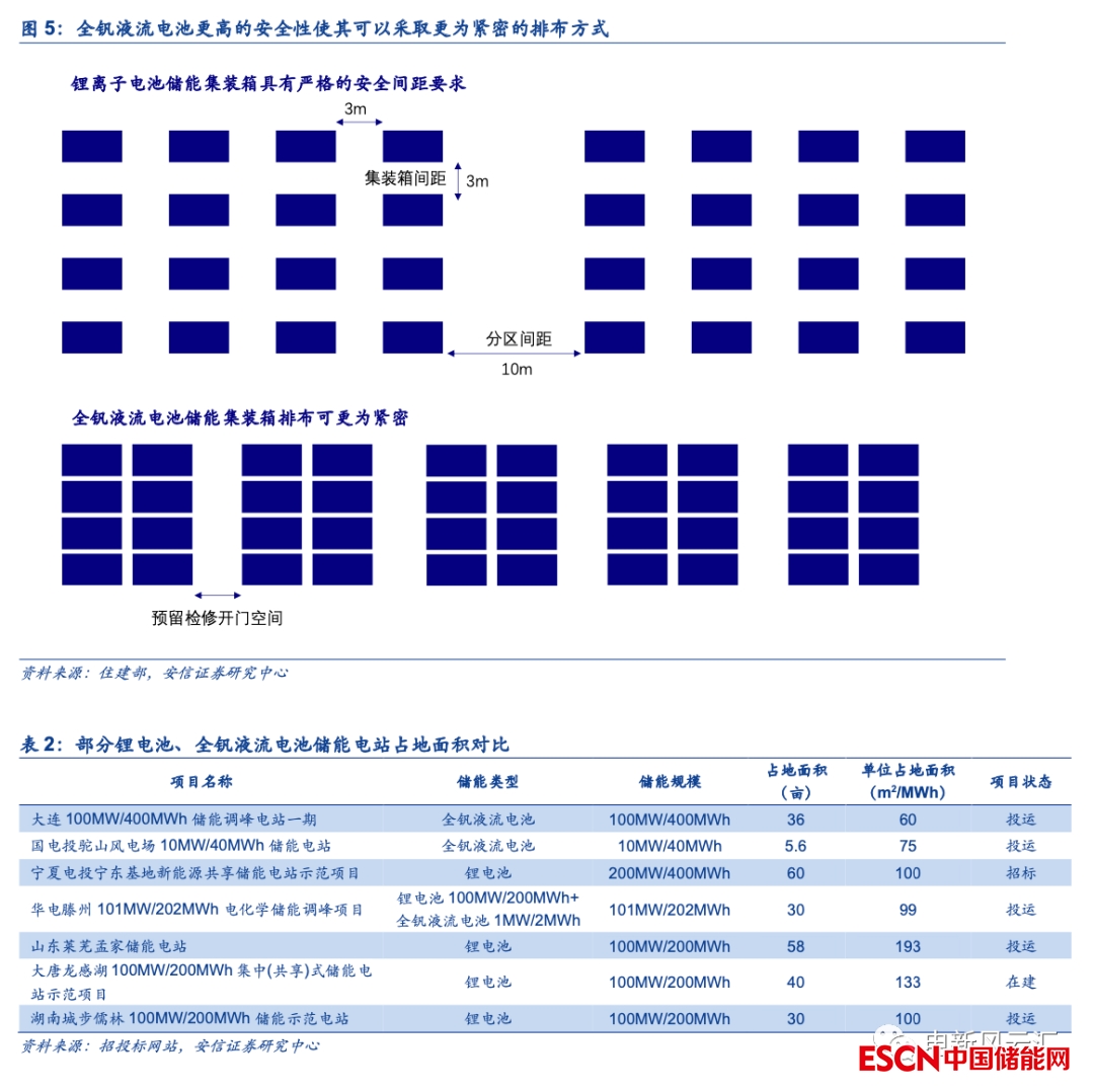 全釩液流電池更高的安全性使其可以采取更為緊密的排布方式,從而在項目層面減少土地的占用。相較于鋰離子電池,全釩液流電池在單體能量密度上存在較大差距,例如大連融科20尺儲能集裝箱產(chǎn)品TPower的儲能容量為0.5MWh,而當(dāng)前主流鋰電池儲能集成商的20尺集裝箱系統(tǒng)儲存容量一般超過3MWh。但是對于大型儲能項目,鋰離子電池儲能系統(tǒng)需要滿足更為嚴格的消防及安全標(biāo)準,因此在集裝箱的排布上必須留出更大的安全距離。住建部2022年6月發(fā)布的《電化學(xué)儲能電站設(shè)計標(biāo)準(征求意見稿)》中明確指出鋰離子電池預(yù)制艙長邊及短邊間距均不宜小于3m,同時鋰離子電池設(shè)備宜分區(qū)布置,屋外電池預(yù)制艙(柜)布置分區(qū)內(nèi)儲能系統(tǒng)額定能量不宜超過50MWh,相鄰分區(qū)的間距不應(yīng)小于10m,而對于全釩液流電池,征求意見稿并未作出相應(yīng)的規(guī)定。表2列示了部分建成及在建全釩液流電池儲能電站和鋰電池儲能電站的占地面積情況,就這些項目而言全釩液流電池儲能電站的單位占地面積明顯小于鋰電池儲能電站。因此,我們認為全釩液流電池的本征安全性可以使其采取更為緊密的排布方式,從而部分彌補其在能量密度上的劣勢,節(jié)省儲能項目的土地占用。