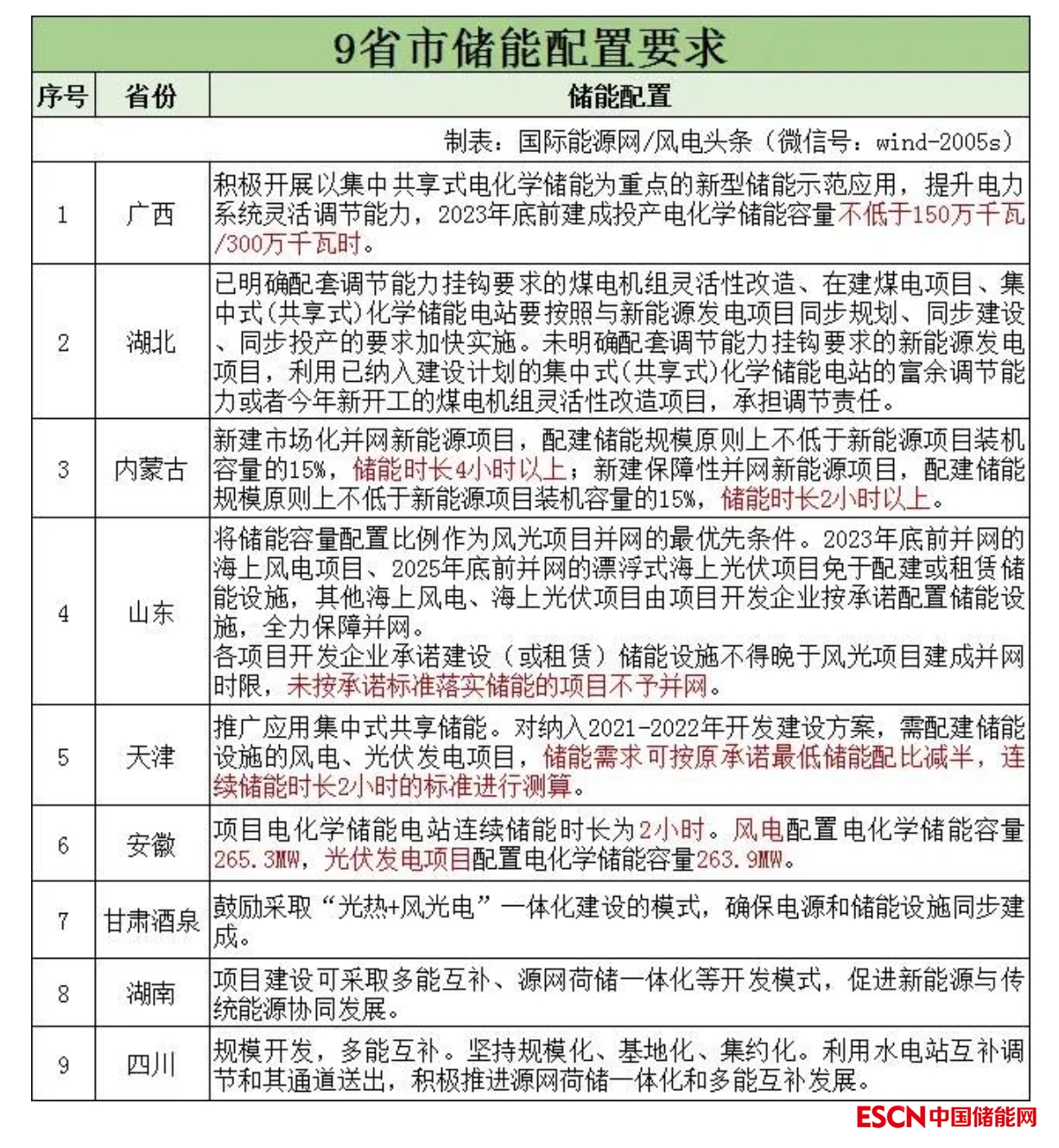 國際能源網(wǎng)/風電頭條(微信號:wind-2005s)梳理,廣西、湖北、內蒙古、山東、天津、安徽、甘肅酒泉、湖南、四川9省市明確風光配套儲能。