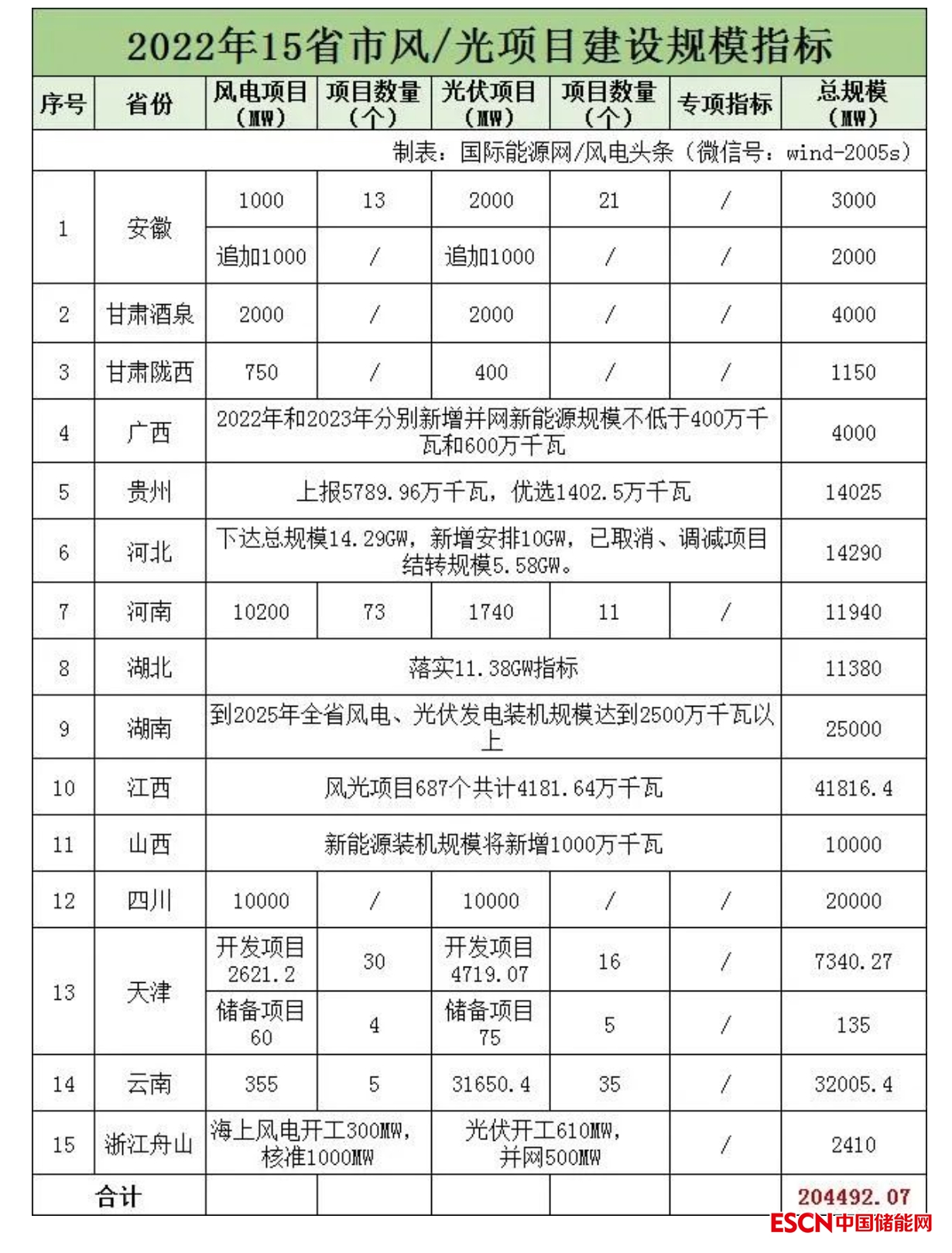 中國儲能網(wǎng)訊:據(jù)不完全統(tǒng)計了2022年各省對風電、光伏下達的建設方案政策,下發(fā)政策的省份有安徽、廣西、貴州、河北、河南、湖北、湖南、江西、內蒙古、山西、四川、天津、云南、浙江舟山、山東、甘肅酒泉、甘肅隴西17省市。其中有15省市明確了風電、光伏發(fā)電規(guī)模指標,總規(guī)模達204492.07MW(約204.49GW),有9省市明確儲能配置要求。
