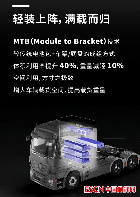 日前,動力電池龍頭企業(yè)寧德時代(SZ300750,股價421.01元,市值1.03萬億元)發(fā)布了其首創(chuàng)的 MTB(Module to Bracket,模塊集成底盤)技術(shù)。據(jù)了解,這是一項應(yīng)用于重卡和工程機械的新型電池模組技術(shù),與傳統(tǒng)電池包+車架/底盤的成組方式相比,可提升系統(tǒng)體積利用率40%,并減重10%。