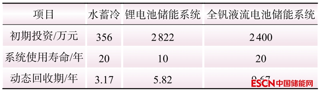 儲能設(shè)備的經(jīng)濟性如表3所示,從表3可以看出,水蓄冷系統(tǒng)初期投資小,靜態(tài)投資回收期短,投資收益穩(wěn)定。鋰電池儲能系統(tǒng)單位投資成本低,靜態(tài)回收期短,但是使用壽命相比全釩液流電池儲能系統(tǒng)短。