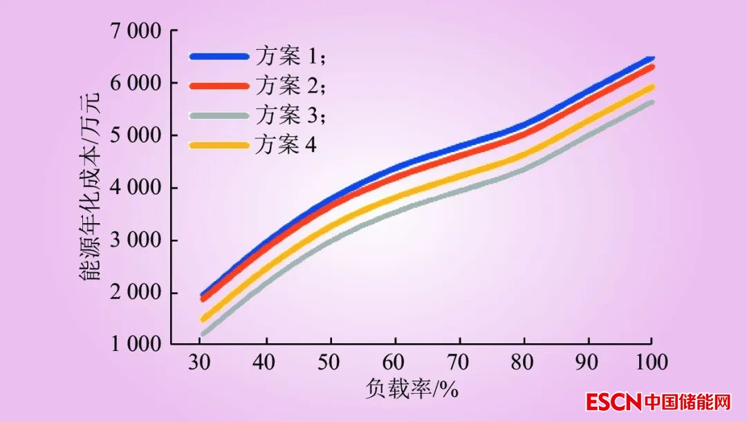 以上述數(shù)據(jù)中心為例,開展考慮多種儲能設(shè)備配置方案的經(jīng)濟效益分析,計算不同負(fù)載率下數(shù)據(jù)中心全年能源系統(tǒng)運行成本,如圖7所示。從圖7可以看出,隨著負(fù)載率的上升,數(shù)據(jù)中心全年能源系統(tǒng)的運行成本上升,配置水蓄冷和鋰電池儲能系統(tǒng)的方案3最具經(jīng)濟性。