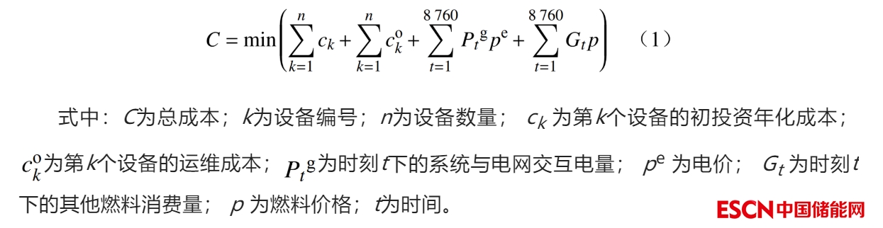 以系統(tǒng)經(jīng)濟性最優(yōu)為目標(biāo),給出數(shù)據(jù)中心綜合能源系統(tǒng)配置方案。其中,經(jīng)濟性最優(yōu)包括設(shè)備固定成本、設(shè)備運維成本、燃料成本等。本文的目標(biāo)函數(shù)為