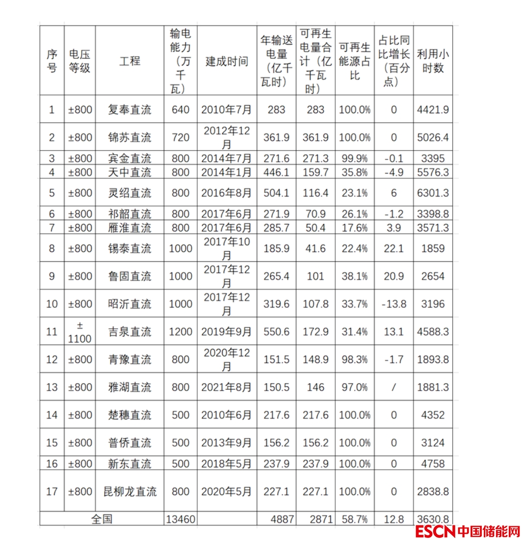 2021年,我國在運直流特高壓共計17條,總輸電能力約1.34億千瓦時。通報顯示直流特高壓全年輸送電量4887億千瓦時,其中可再生能源電量2871億千瓦時,同比提高18.3%,可再生能源電量占全部輸送電量的58.7%。根據(jù)統(tǒng)計直流特高壓的輸電能力,2021年全國直流特高壓的平均輸電小時數(shù)約為3630小時。各直流輸電情況見表1: