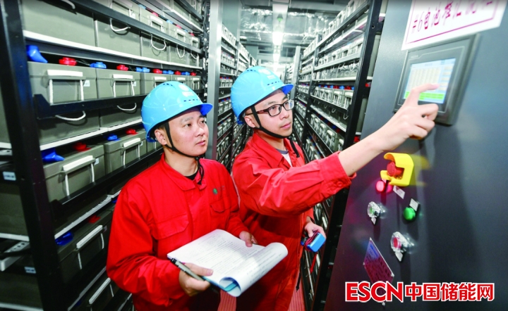 長興縣10千伏雉城儲能電站,國網(wǎng)長興縣供電公司的工作人員正在BMS電池管理系統(tǒng)監(jiān)控顯示屏上核對該組電池狀態(tài)