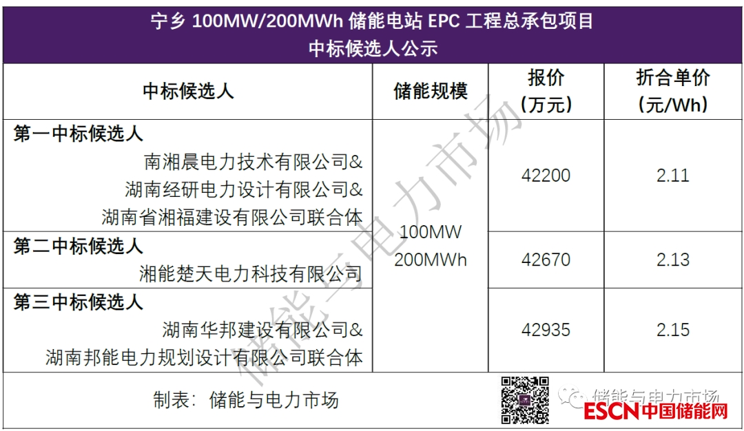 中國儲能網(wǎng)訊:近日寧鄉(xiāng)100MW/200MWh儲能電站EPC工程總承包項目發(fā)布中標(biāo)候選人公示。湖南湘晨電力技術(shù)有限公司&湖南經(jīng)研電力設(shè)計有限公司&湖南省湘福建設(shè)有限公司聯(lián)合體以總報價42200萬元,折合單價2.11元/Wh,成為第一中標(biāo)候選人。中標(biāo)候選人信息如下。