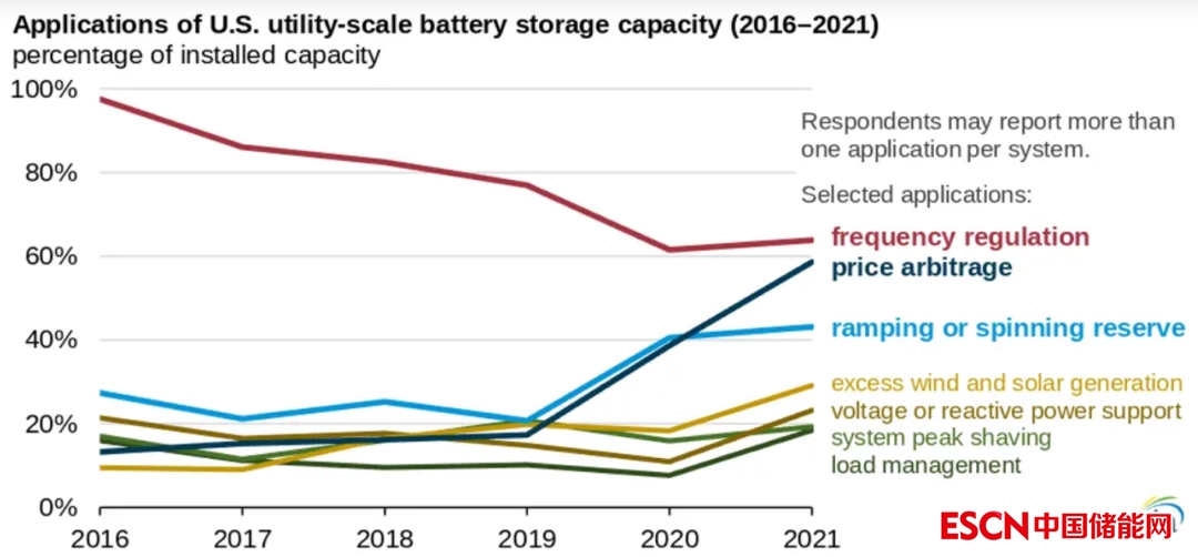 2021年,美國(guó)公用事業(yè)規(guī)模的4.6吉瓦的電池儲(chǔ)能容量中有59%用于價(jià)格套利,高于2019年的17%。在某些地區(qū)的電力市場(chǎng),價(jià)格套利比其他市場(chǎng)使用的更多。例如,2021年加州獨(dú)立系統(tǒng)運(yùn)營(yíng)商服務(wù)區(qū)增加的電池儲(chǔ)能容量中有80%以上用于價(jià)格套利。