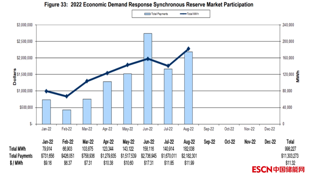需求響應(yīng)資源在2022年參與同步備用市場的收益如下圖,整體電量大約是調(diào)頻市場的10倍,不過收益相比調(diào)頻較低,平均為10美元/兆瓦時。