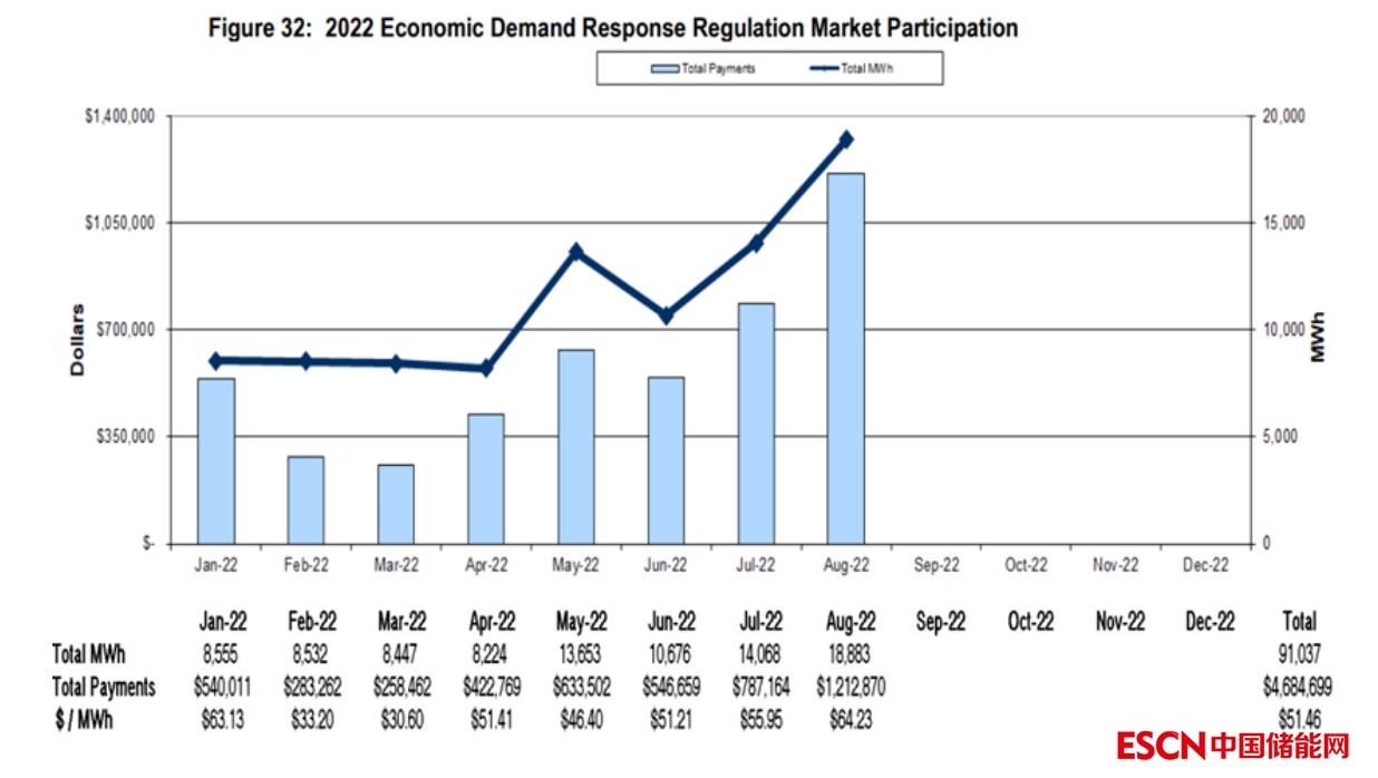截至今年9月的調(diào)頻市場統(tǒng)計顯示,需求響應(yīng)資源提供調(diào)頻服務(wù)平均可獲得40-60美元/兆瓦時的收益,但整體參與量較小。