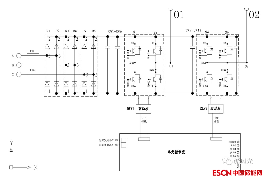 圖2 水冷型超大功率高壓變頻器功率柜外形及內(nèi)部結(jié)構(gòu)圖功率單元是使用功率電力電子器件進(jìn)行整流、濾波、逆變的高壓變頻器部件,也是構(gòu)成高壓變頻器主回路的主要部分。每個(gè)功率單元都相當(dāng)于一臺(tái)交-直-交電壓型單相低壓變頻器。每個(gè)功率單元由H橋構(gòu)成,輸出一組SPWM波,每相8個(gè)單元,通過疊加輸出一組17個(gè)電平的正弦波;同一相中的每個(gè)功率單元的采樣頻率一致,用同一個(gè)載波進(jìn)行調(diào)制,載波相差1/N個(gè)采樣周期。單元原理示意圖如圖3所示。