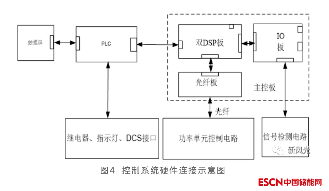 本項(xiàng)目功率單元輸出電流比較大,一般風(fēng)冷系統(tǒng)已經(jīng)不能滿足設(shè)備的散熱需求,因此功率單元采用液冷散熱結(jié)合方式,功率柜有主進(jìn)水管和出水管。控制系統(tǒng)是整個(gè)水冷型超大功率高壓變頻調(diào)速系統(tǒng)的核心,它根據(jù)用戶在本地或遠(yuǎn)程的操作和設(shè)置,并采集系統(tǒng)中電壓、電流模擬量,及各開關(guān)量,進(jìn)行邏輯處理和計(jì)算后,決定并控制各功率單元的動(dòng)作,進(jìn)一步驅(qū)動(dòng)電機(jī),滿足輸出要求??刂葡到y(tǒng)連接示意圖如圖4所示。整機(jī)主控制系統(tǒng)有如下幾部分,主控板采用高速的數(shù)字信號(hào)處理器DSP為核心控制器,負(fù)責(zé)所有數(shù)據(jù)處理、算法實(shí)現(xiàn)及PWM波形計(jì)算,經(jīng)光纖板電光信號(hào)轉(zhuǎn)換后與功率單元進(jìn)行信息交互。PLC負(fù)責(zé)所有電氣件的狀態(tài)的掃描和控制,與主控板通信并將各種報(bào)警信息上傳至主控板。觸摸屏與PLC通信實(shí)現(xiàn)各種運(yùn)行參數(shù)和數(shù)據(jù)的在線設(shè)置、修改、顯示和處理等功能。