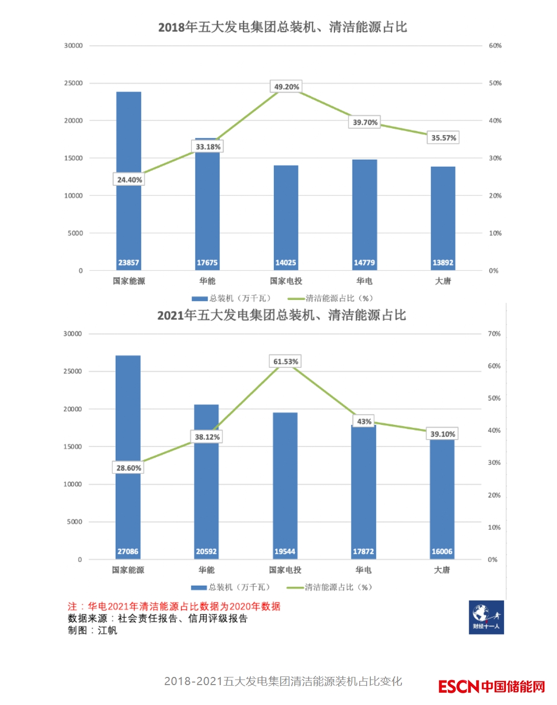 四年過去,舒印彪掌舵的華能在清潔能源裝機(jī)上奮起直追。上任之初,華能發(fā)電裝機(jī)第一的名頭已經(jīng)被合并后的國家能源集團(tuán)超越,2018年底清潔能源裝機(jī)比例為33%,電力央企中僅高于煤電機(jī)組為主的國家能源集團(tuán)。截至2022年6月底,華能集團(tuán)清潔能源裝機(jī)達(dá)到8298萬千瓦,占比提高至39.37%。