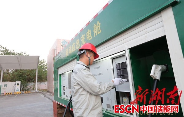 △國(guó)網(wǎng)衡陽(yáng)供電公司員工在京港澳高速公路耒陽(yáng)服務(wù)區(qū)調(diào)試應(yīng)急充電艙。陳妍霏 攝