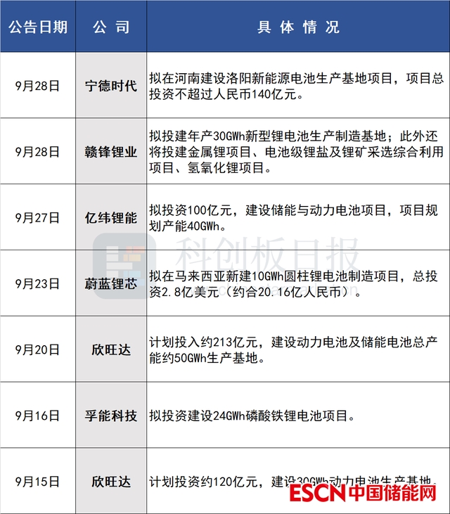據(jù)《科創(chuàng)板日報》不完全統(tǒng)計,近半個月以來,寧德時代、贛鋒鋰業(yè)、億緯鋰能、蔚藍鋰芯、欣旺達、孚能科技6家鋰電池公司已宣告大手筆擴產(chǎn)計劃,且多數(shù)為百億級別項目: