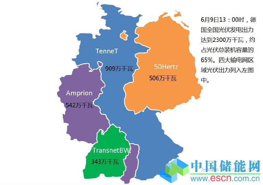 德國國土面積大概36萬平方公里,比我國四川省面積還小,南北直線距離為876公里,東西直線距離為640公里,所以太陽輻照的全國一致性比較好,光伏出力的同時率也比較高。6月9日13:00時德國光伏出力達到2300萬千瓦,而光伏發(fā)電總裝機約3500萬千瓦,光伏最大出力占裝機容量的比例約65%。6月9日13:00四大輸電網區(qū)域光伏出力分布圖如圖2所示。