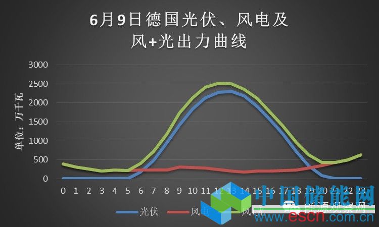 一般認為,風電和光伏出力均具有波動性,但是兩者擬合之后的出力曲線的波動性會減弱,德國是否也負荷這一規(guī)律呢?還是讓事實說話。我們發(fā)現,當日德國風電出力非常弱,全天波動性并不大,基本維持在300萬千瓦左右,這相對于全國3300萬千瓦左右的風電裝機來說確實小的可憐,風電出力占風電裝機容量的比重僅為10%左右。中午光伏大發(fā)時段,風電出力也沒有明顯波動,所以風+光的出力曲線與光伏出力曲線走向非常吻合。當然,這只能代表6月9日這一天的情況。
