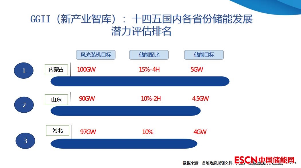 這組數(shù)據(jù)是新產(chǎn)業(yè)智庫(kù)(GGII)3月份的數(shù)據(jù),“十四五”國(guó)內(nèi)各省份儲(chǔ)能發(fā)展?jié)摿υu(píng)估排名,內(nèi)蒙古是第一,儲(chǔ)能的配比是15%,目標(biāo)是5GW。去年8月27號(hào),內(nèi)蒙古自治區(qū)文件要求化學(xué)儲(chǔ)能容量不低于項(xiàng)目總裝機(jī)15%、2小時(shí),這是保障性的。2022年政府最新文件,市場(chǎng)性的并網(wǎng)更加細(xì)化了,提到15%和4小時(shí)。這也是一幅地圖,中央出的文件,“十四五”期間沙漠戈壁大型的基地,都是在西部的,從西部距離北京最近,離中原地區(qū)最近就是內(nèi)蒙古,而且第一批大基地就是1000萬(wàn)到1300萬(wàn),第二批大基地已基本落實(shí),落到三峽、華能、內(nèi)蒙古能建等大型企業(yè),由幾個(gè)企業(yè)共同開(kāi)發(fā),未來(lái)新能源的開(kāi)發(fā)市場(chǎng)特別大,初步預(yù)估,未來(lái)拉動(dòng)產(chǎn)業(yè)鏈投資約4萬(wàn)億左右。