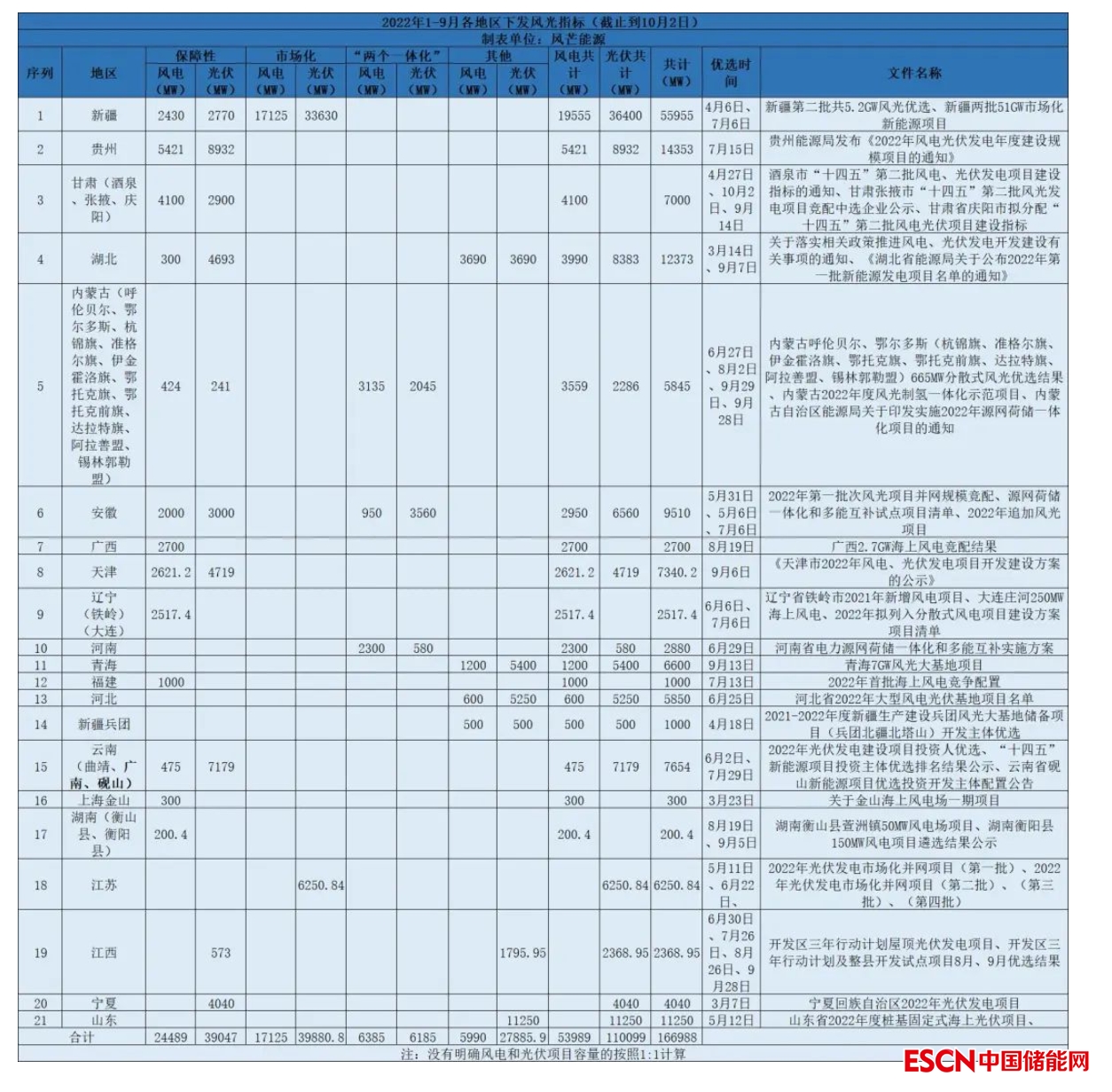 中國儲能網(wǎng)訊:根據(jù)公開信息不完全統(tǒng)計(jì),2022年1-9月共有21個(gè)省(市)合計(jì)166.988GW風(fēng)光項(xiàng)目完成競配。其中風(fēng)電53.989GW,光伏110.099GW。