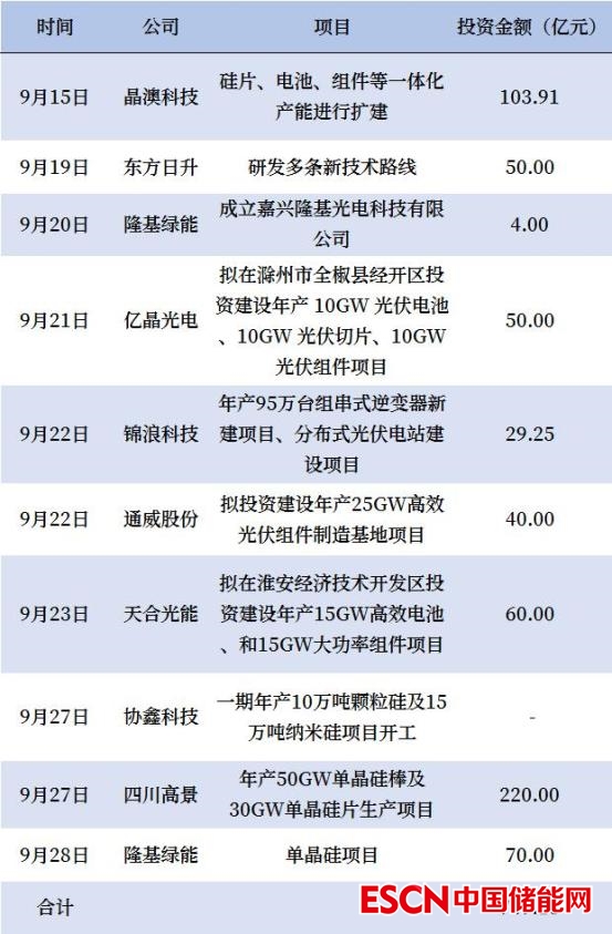 9月,多家光伏企業(yè)開辟新項(xiàng)目,據(jù)不完全統(tǒng)計(jì),多家光伏企業(yè)在半個(gè)月的時(shí)間內(nèi)已經(jīng)擴(kuò)產(chǎn)近千億元的項(xiàng)目。