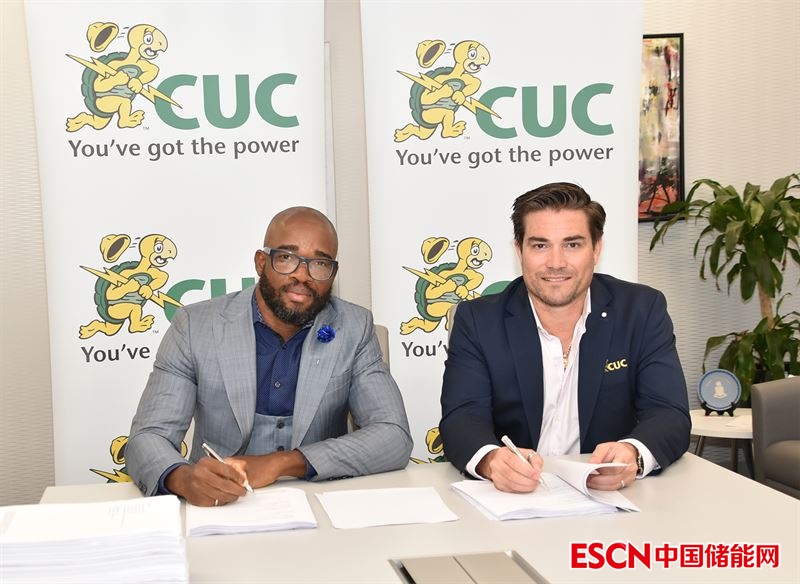 瓦錫蘭公司的Edmund Phillips(左)和加勒比公用事業(yè)有限公司(CUC)的Sacha Tibbetts簽署20MW/20MWh電池儲能系統(tǒng)合同