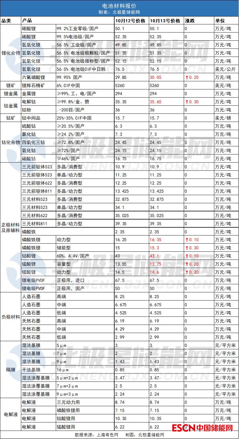 中國儲能網(wǎng)訊:10月13日,六氟磷酸鋰價格上漲2000元/噸,電解鈷上漲3000元/噸,磷酸鐵鋰動力型上漲1000元/噸,儲能型上漲3000元/噸。