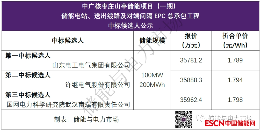 山東電工電氣以總價3.578億,折合單價1.789元/Wh,成為第一中標(biāo)候選人。許繼電氣、武漢南瑞分列第二和第三中標(biāo)候選人。