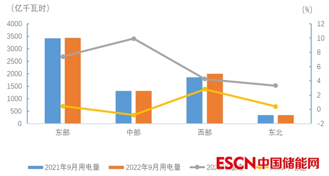 9月份,東、中、西部和東北地區(qū)全社會(huì)用電量增速分別為0.5%、-0.8%、2.9%和0.4%。