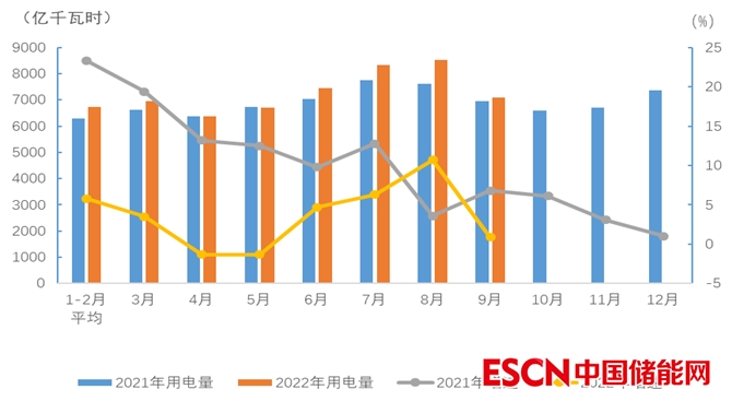 圖1 2021、2022年分月全社會(huì)用電量及其增速