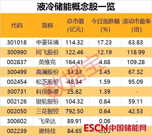 值得注意的是,今日多只液冷儲(chǔ)能概念股大幅上漲,申菱環(huán)境(301018)一度上漲20%;同飛股份收漲超12%,公司股價(jià)今日創(chuàng)歷史新高;英維克股價(jià)也于今日創(chuàng)出歷史新高。