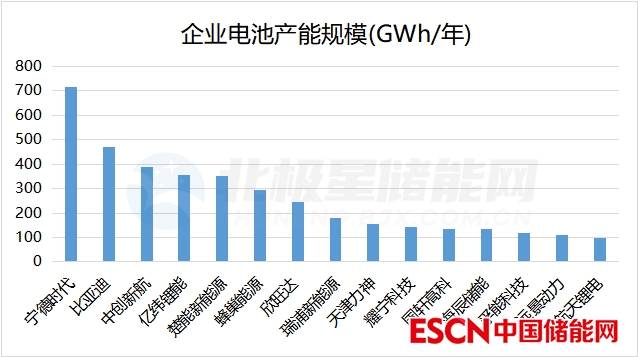 現(xiàn)階段,產(chǎn)能超100GWh以上的企業(yè)共有15家,總產(chǎn)能達(dá)到3909GWh、占據(jù)近八成的市場份額。具體包括:寧德時代、比亞迪、中創(chuàng)新航、億緯鋰能、楚能新能源、蜂巢能源、欣旺達(dá)、瑞浦新能源、天津力神、耀寧科技、國軒高科、海辰儲能、孚能科技、遠(yuǎn)景動力、航天鋰電。