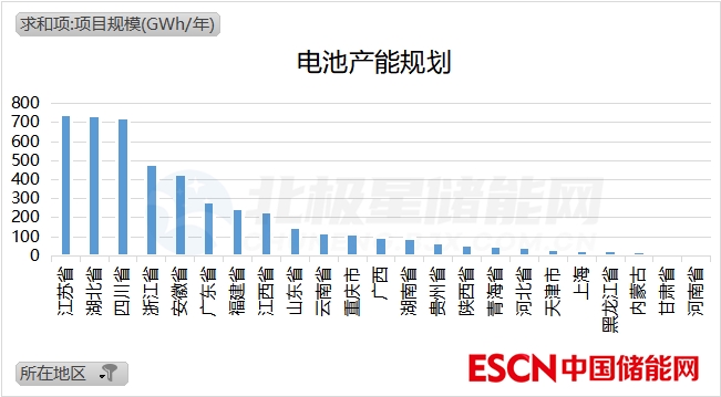 按省份來看,江蘇、湖北、四川電池產(chǎn)能第一梯隊、均超過700GWh,浙江、安徽、廣東、福建、江西等省份電池產(chǎn)能超過200GWh。