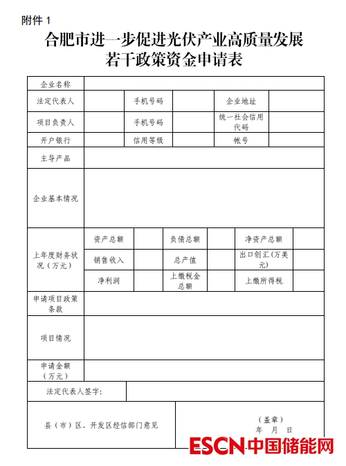 1.《合肥市進(jìn)一步促進(jìn)光伏產(chǎn)業(yè)高質(zhì)量發(fā)展若干政策資金申請(qǐng)表》(附件 1)。