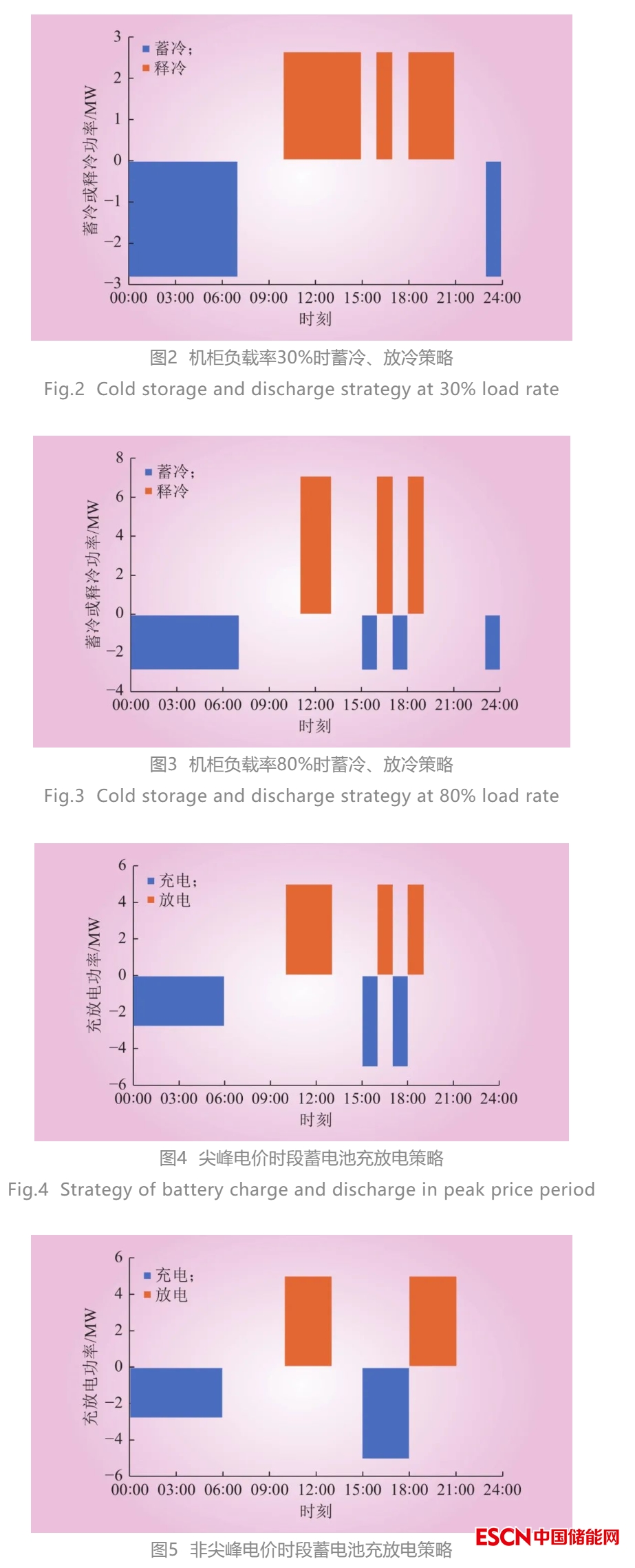 考慮儲(chǔ)能運(yùn)行優(yōu)化策略的原則是充分利用谷段、平段電價(jià)時(shí)段儲(chǔ)能以滿足尖峰段、峰段電價(jià)時(shí)的能源需求。不同參數(shù)對(duì)應(yīng)的蓄冷、放冷時(shí)長(zhǎng)如表2所示。圖2和圖3分別為機(jī)柜負(fù)載率30%和80%時(shí)的控制策略。從圖2~3可以看出,30%機(jī)柜負(fù)載率下,實(shí)行一充三放,利用谷電蓄冷、峰段釋冷;80%機(jī)柜負(fù)載率下,實(shí)行三充三放,利用谷電和平段蓄冷,峰段釋冷。