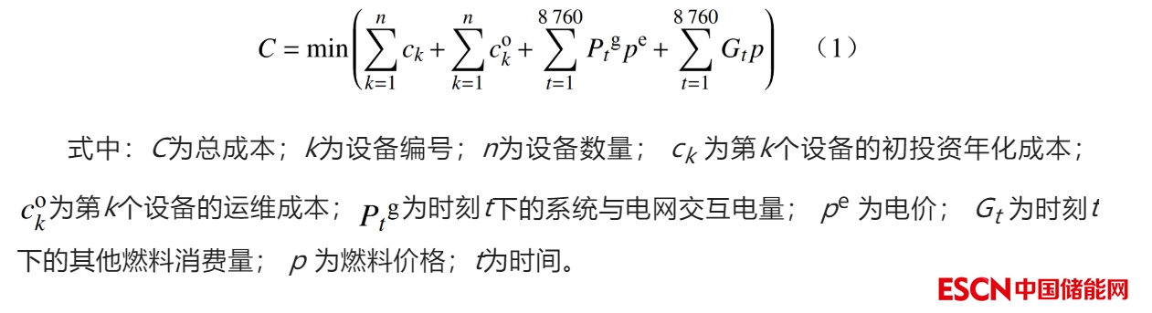 以系統(tǒng)經(jīng)濟(jì)性最優(yōu)為目標(biāo),給出數(shù)據(jù)中心綜合能源系統(tǒng)配置方案。其中,經(jīng)濟(jì)性最優(yōu)包括設(shè)備固定成本、設(shè)備運(yùn)維成本、燃料成本等。本文的目標(biāo)函數(shù)為