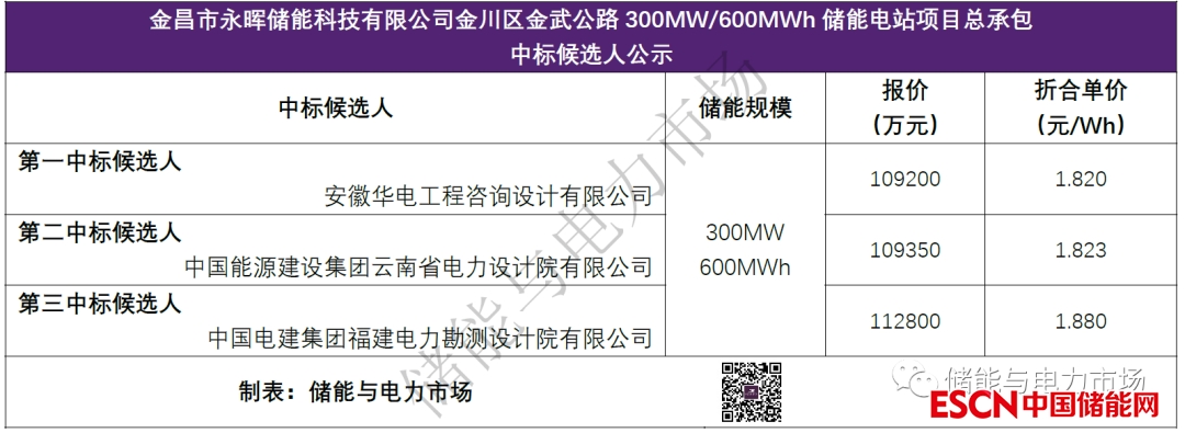 中國儲能網(wǎng)訊:近日金昌市永暉儲能科技有限公司金川區(qū)金武公路300MW/600MWh儲能電站項(xiàng)目總承包項(xiàng)目發(fā)布了中標(biāo)候選人公示,安徽華電工程咨詢設(shè)計(jì)有限公司以總報(bào)價10.92億元,折合單價1.820元/Wh,成為第一中標(biāo)候選人。中標(biāo)候選人情況如下表。