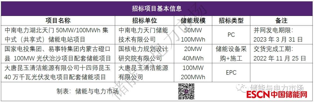 中國(guó)儲(chǔ)能網(wǎng)訊:近日中南電力、國(guó)電投、大唐分別發(fā)布了儲(chǔ)能系統(tǒng)采購(gòu)/儲(chǔ)能項(xiàng)目EPC招標(biāo)公告,涉及儲(chǔ)能規(guī)模170MW/340MWh,如下表所示。
