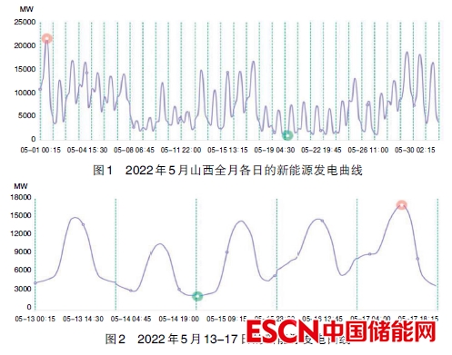 圖1展示了山西新能源在2022年5月各日的發(fā)電曲線,可以看出,1~7日平均發(fā)電量較多,8~12日平均發(fā)電明顯偏少,13~17日有所恢復(fù),然后除了月底3天之外,剩下來的天數(shù)新能源發(fā)電都很少。
