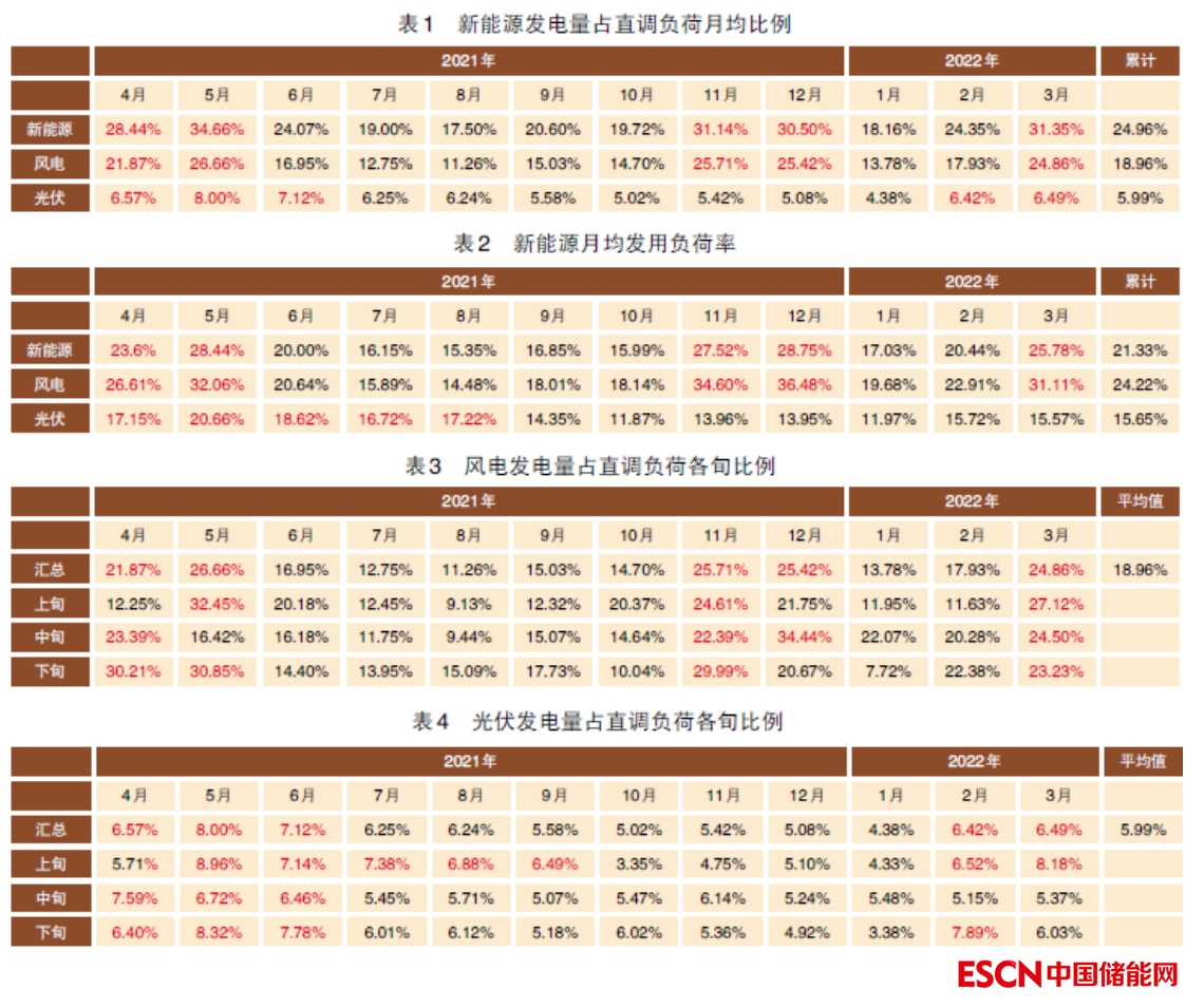 下面的表1展示的是新能源發(fā)電量占直調(diào)負(fù)荷用電量的比例,表2展示的是新能源自身的月均負(fù)荷率??梢钥吹?,新能源發(fā)電存在明顯的月度不均衡,從負(fù)荷率來說,風(fēng)電在2021年4、5、11、12月以及2022年3月發(fā)電較多,遠(yuǎn)超其他月份;光伏發(fā)電在2021年4、5、6、7、8月比較多,不同月份的相對量變化也非常大。