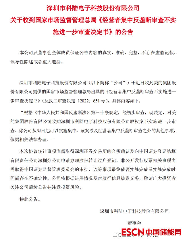 “根據(jù)《中華人民共和國反壟斷法》第三十條規(guī)定,經(jīng)初步審查,現(xiàn)決定,對美的集團(tuán)股份有限公司收購深圳市科陸電子科技股份有限公司股權(quán)案不實(shí)施進(jìn)一步審查。你公司從即日起可以實(shí)施集中。該案涉及經(jīng)營者集中反壟斷審查之外的其他事項(xiàng),依據(jù)相關(guān)法律辦理?!?