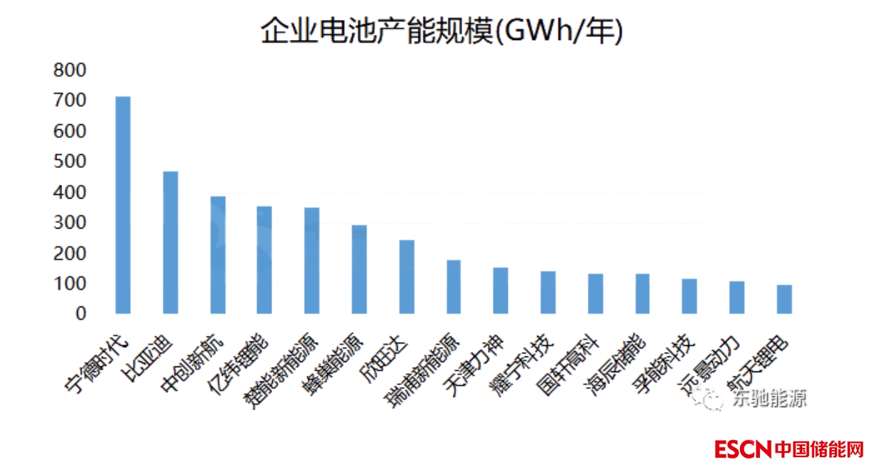 現(xiàn)階段,產(chǎn)能超100GWh以上的企業(yè)共有15家,總產(chǎn)能達到3909GWh、占據(jù)近八成的市場份額。具體包括:寧德時代、比亞迪、中創(chuàng)新航、億緯鋰能、楚能新能源、蜂巢能源、欣旺達、瑞浦新能源、天津力神、耀寧科技、國軒高科、海辰儲能、孚能科技、遠景動力、航天鋰電。